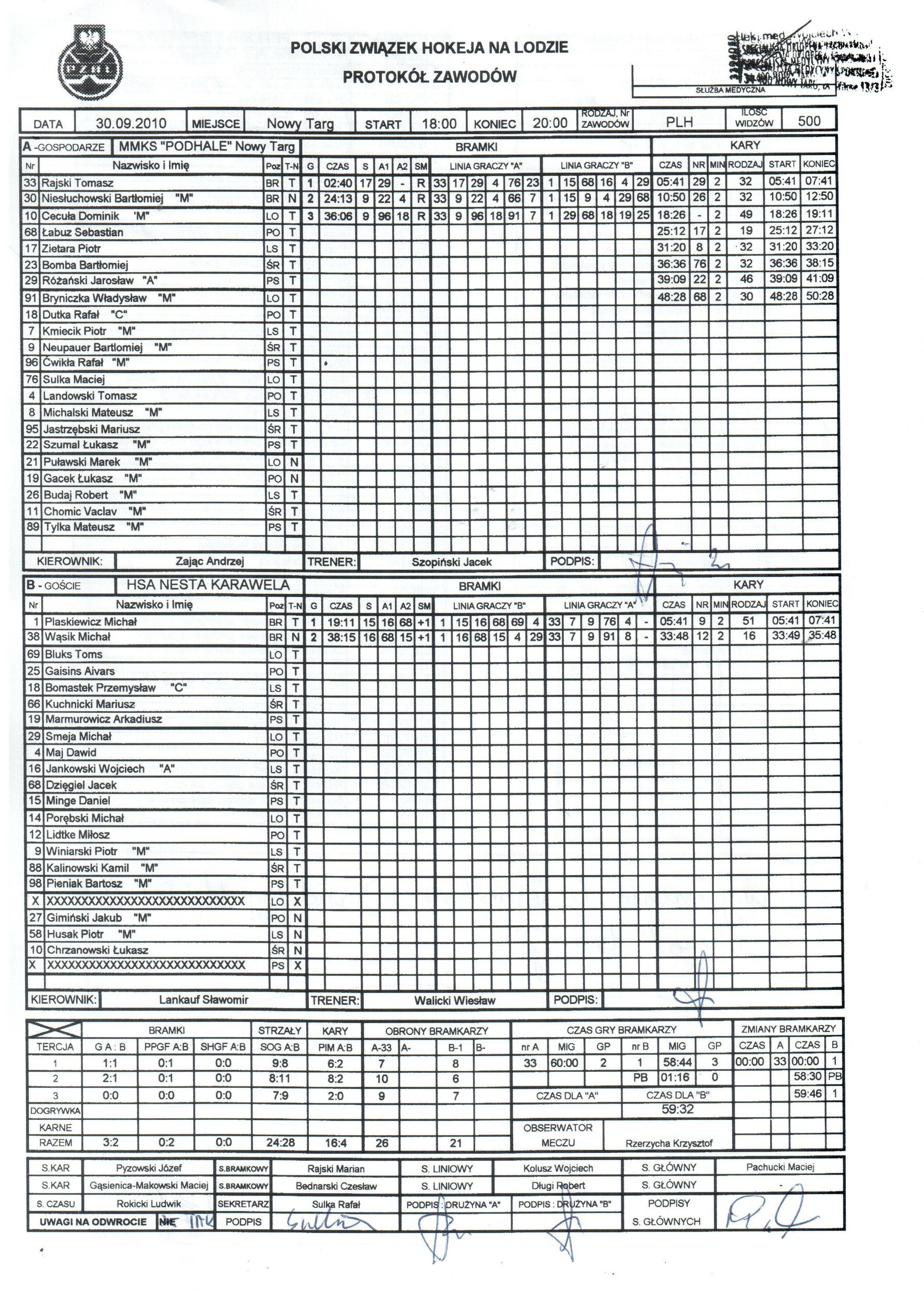 MMKS Podhale: Tomasz Rajski (60:00), Bartłomiej Niesłuchowski (nie grał), Dominik Cecuła, Sebastian Łabuz (2) - Piotr Ziętara (2), Bartłomiej Bomba, Jarosław Różański A (2); Władysław Bryniczka, Rafał Dutka C - Piotr Kmiecik,, Bartłomiej Neupauer, Rafał Ćwikła; Maciej Sulka (2), Tomasz Landowski - Mateusz Michalski (2), Mariusz Jastrzębski, Łukasz Szumal (2); - Robert Budaj (2), Vaclav Chomic, Mateusz Tylka;