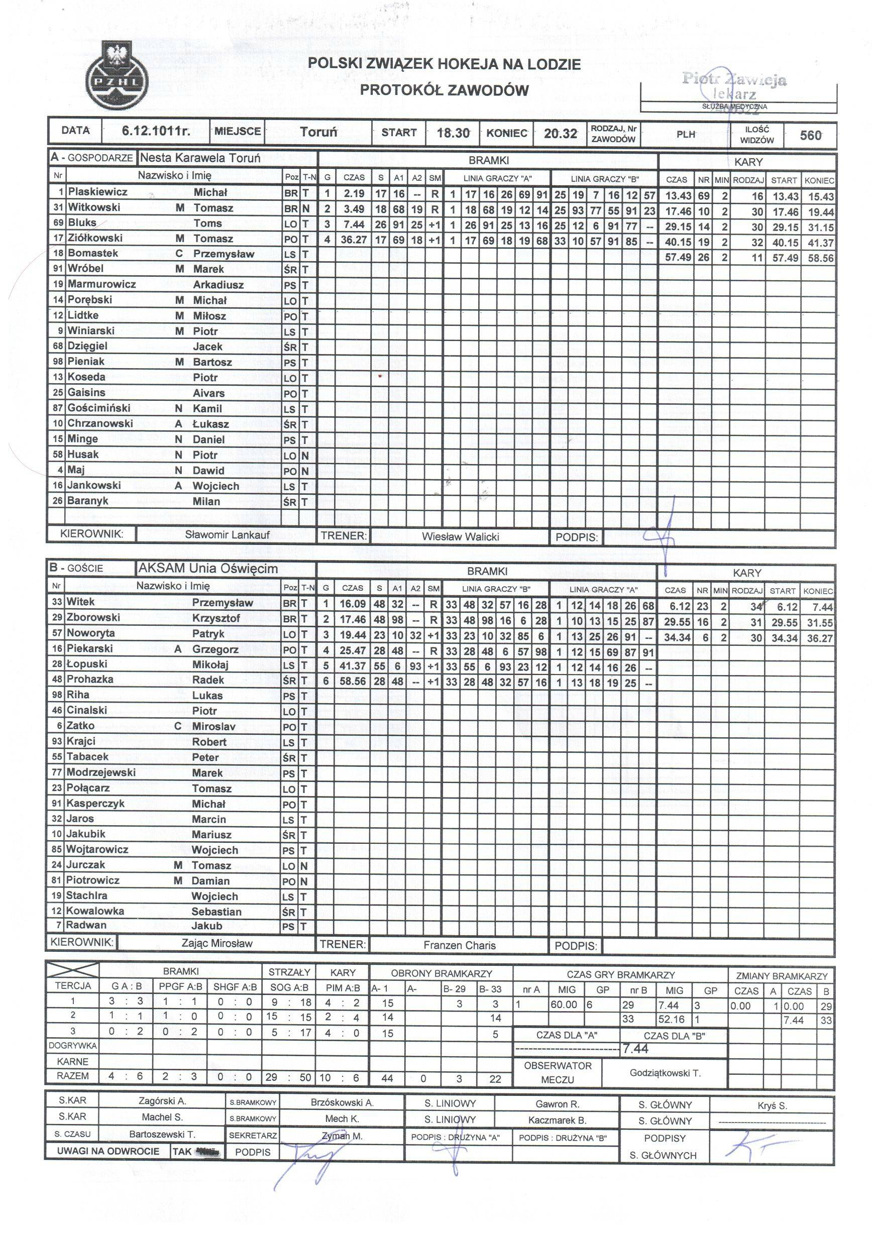Aksam Unia: Krzysztof Zborowski (do 07:44), Przemysław Witek (od 07:45 do 60:00), Patryk Noworyta, Grzegorz Piekarski A (2) - Mikołaj Łopuski, Radek Prochazka, Lukas Riha; Piotr Cinalski, Miroslav Zatko C (2) - Robert Krajci, Peter Tabacek, Marek Modrzejewski; Tomasz Połącarz (2), Michał Kasperczyk - Marcin Jaros, Mariusz Jakubik, Wojciech Wojtarowicz; - Wojciech Stachura, Sebastian Kowalówka, Jakub Radwan;