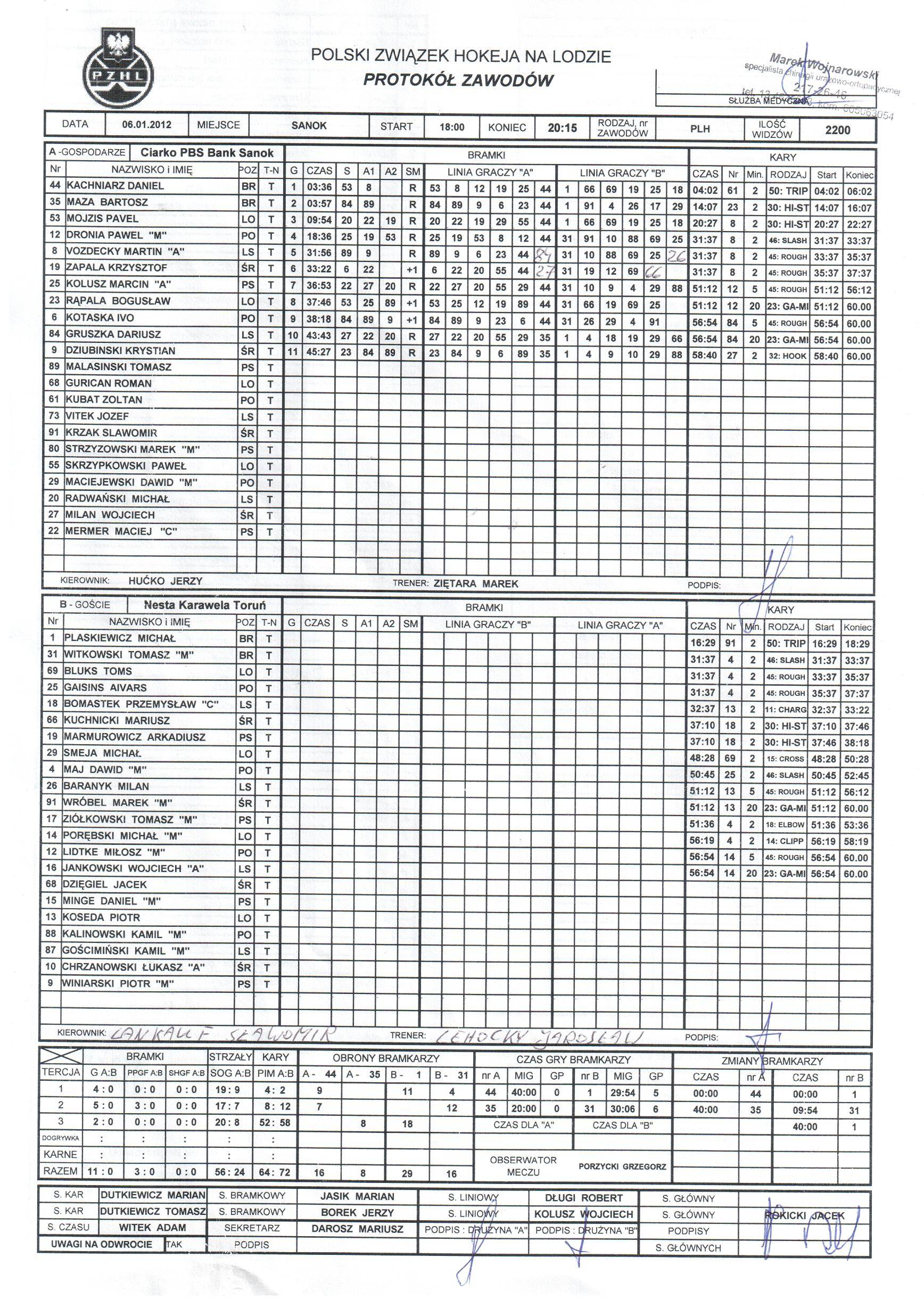 Ciarko PBS Bank: 64 (4, 8, 52) / w tym P. DRONIA 5 min zbyteczna ostrość w grze + kara meczu niesportowe zachowanie, D. GRUSZKA 5 min zbyteczna ostrość w grze + kara meczu za niesportowe zachowanie.; Nesta Karawela: 72 (2, 12, 58) / w tym P. KOSEDA 5 min zbyteczna ostrość w grze + kara meczu niesportowe zachowanie, M. PORĘBSKI 5 min zbyteczna ostrość w grze + kara meczu niesportowe zachowanie, P. BOMASTEK 4 min gra wysoko uniesionym kijem.
