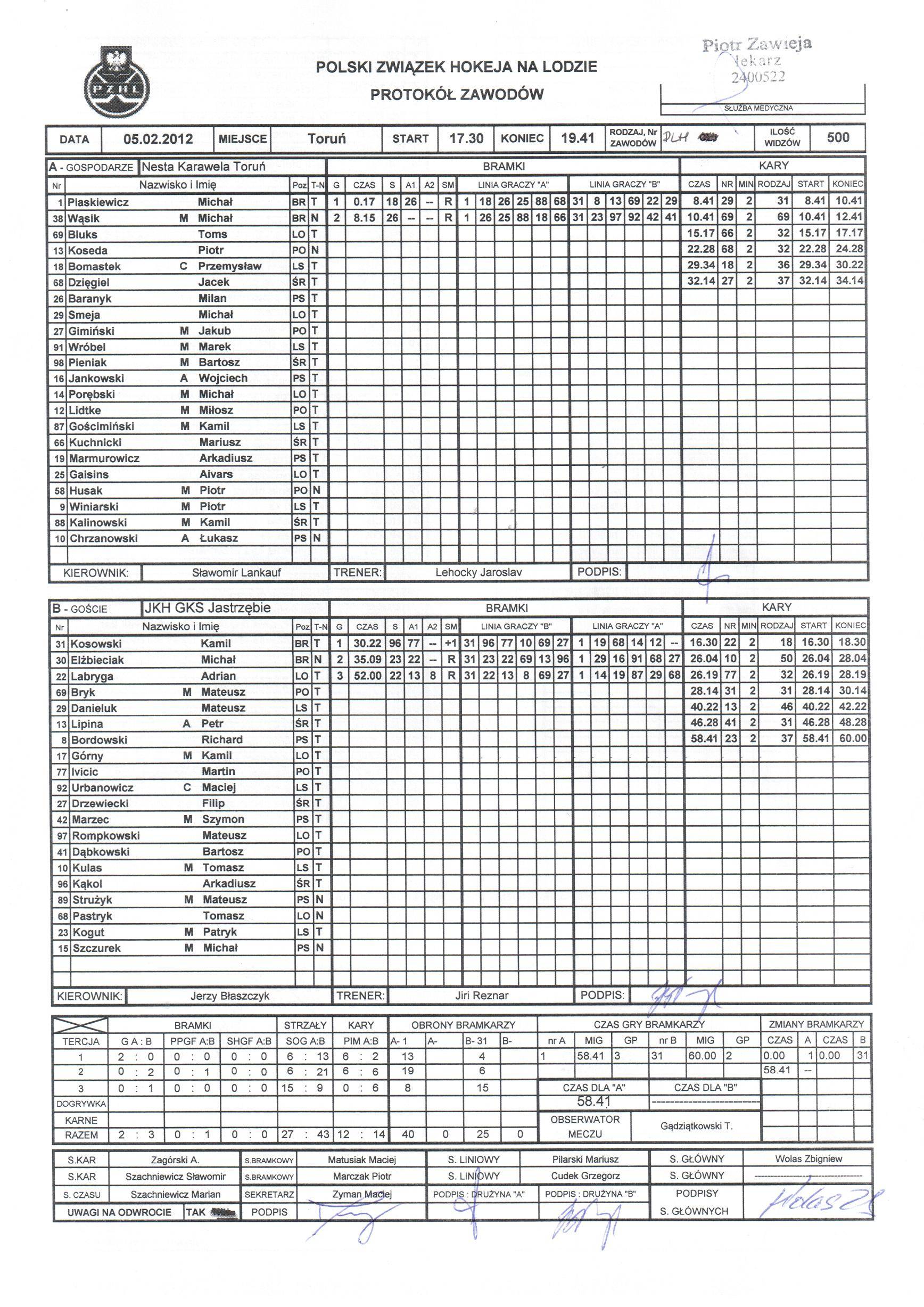 JKH Jastrzębie: Kamil Kosowski (2) (60:00), Michał Elżbieciak (nie grał), Adrian Labryga (2), Mateusz Bryk - Mateusz Danieluk, Petr Lipina A (2), Richard Bordowski; Kamil Górny, Martin Ivicic (2) - Maciej Urbanowicz C, Filip Drzewiecki, Szymon Marzec; Mateusz Rompkowski, Bartosz Dąbkowski (2) - Tomasz Kulas (2), Arkadiusz Kąkol; - Patryk Kogut (2);
