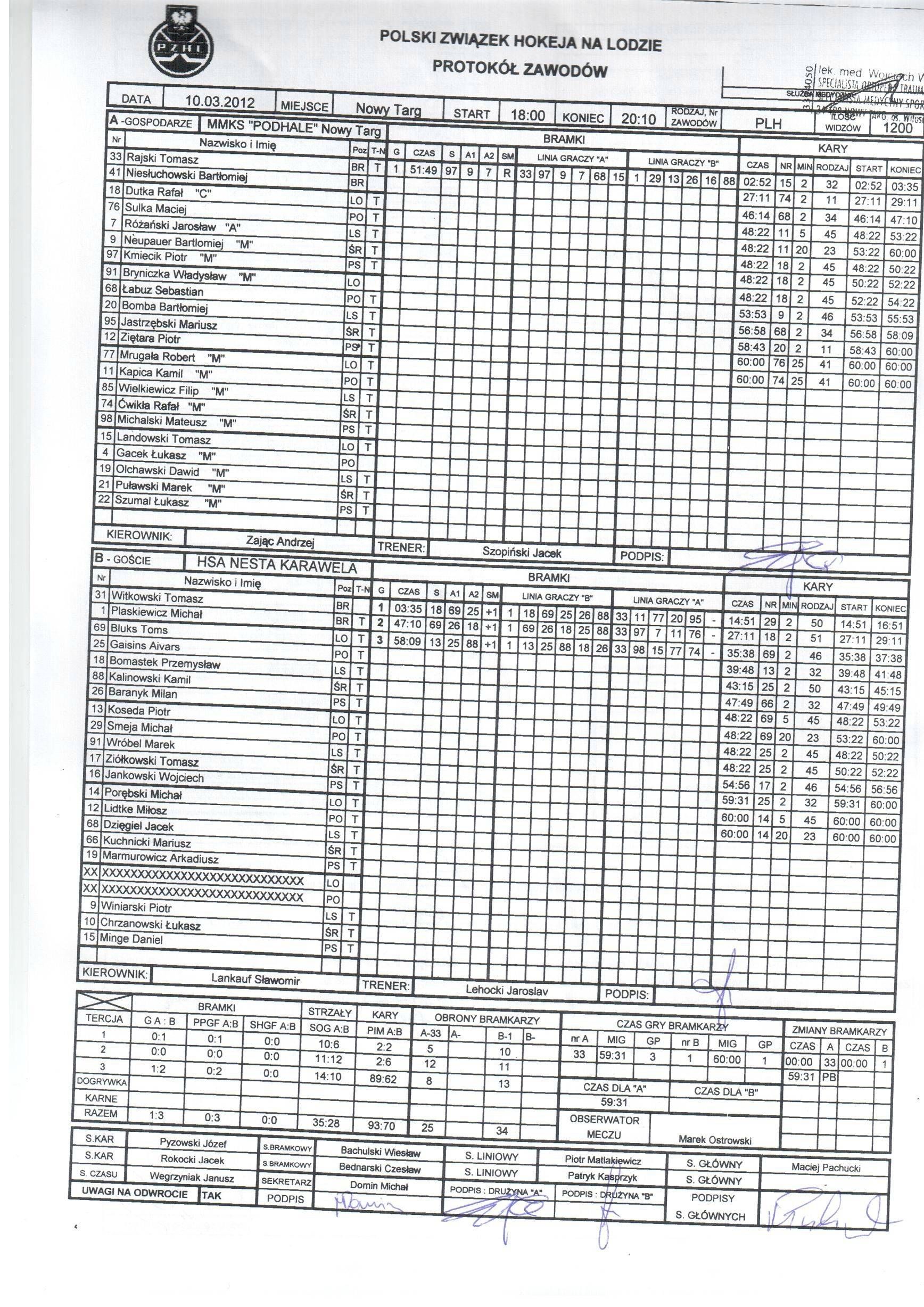 MMKS Podhale: 93 (2, 2, 89) / w tym K. KAPICA 5 min. Zbyteczna ostrość w grze + kara meczu niesportowe zachowanie., M. SULKA 25 min. kara meczu., R. ĆWIKŁA 25 min. kara meczu.; Nesta Karawela: 70 (2, 6, 62) / w tym T. BLUKS 5 min. zbyteczna ostrość w grze + kara meczu niesportowe zachowanie., M. PORĘBSKI 5 min. zbyteczna ostrość w grze + kara meczu niesportowe zachowanie.