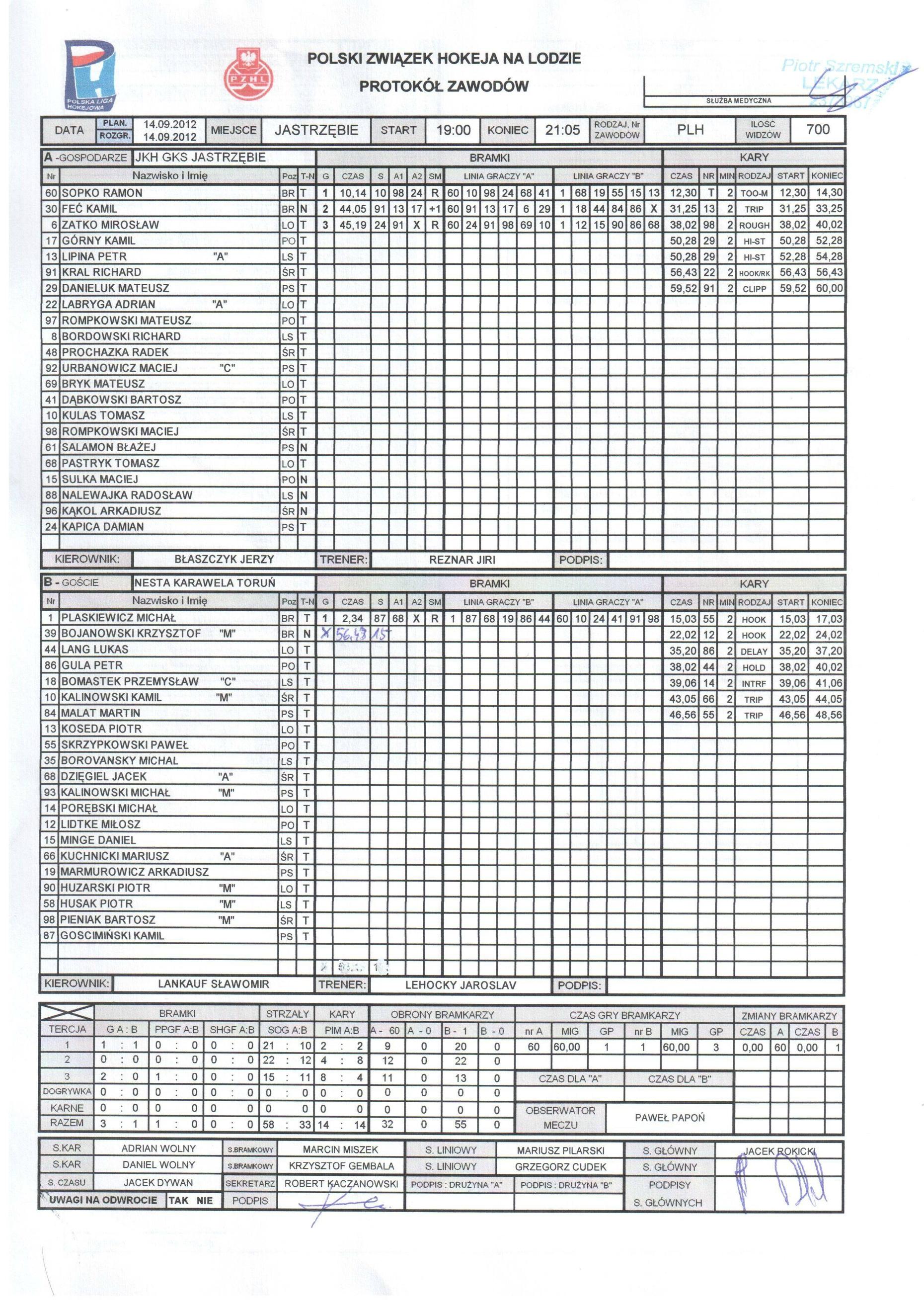 GKS JKH Jastrzębie: 12 (2, 4, 6) / w tym 2 min. kary technicznej, nadmierna ilość graczy na lodzie. i M. DANIELUK 2+2 gra wysoko uniesionym kijem.; Nesta Karawela: 14 (2, 8, 4)