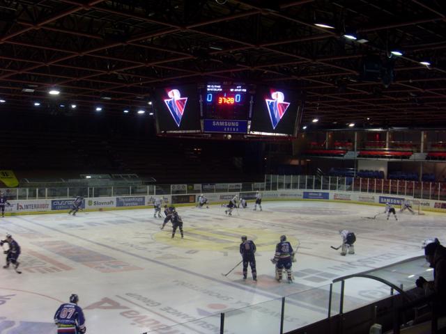 Muzyka i teledysk na telebimach usytuowanych nad lodowiskiem dawały piękny efekt. Brakuje tego u nas w Toruniu. Kibice Slovana też nie byli cicho. Dawali o sobie znać raz po raz. Nie zauważyłem fanów drużyny przeciwnej. Ku mojemu zdziwieniu, nawet w momencie gdy Spiska strzeliła bramkę, fani Slovana nie przestawali się bawić na trybunach. Tego dnia Slovan nie był w najlepszej formie. Mecz, który miał być łatwo wygrany zakończył się tylko wynikiem 3:2 dla gospodarzy. Całe spotkanie prowadzone w szybkim tempie. Podania, które mogły wprawić w osłupienie, strzały z niebieskiej o potężnej sile oraz walka przy bandach. Do tego batalia o każdy krążek, idealne zgranie w drużynie oraz przegląd całej sytuacji. Hokej słowacki niestety jest w wielu elemenach lepszy od naszego.