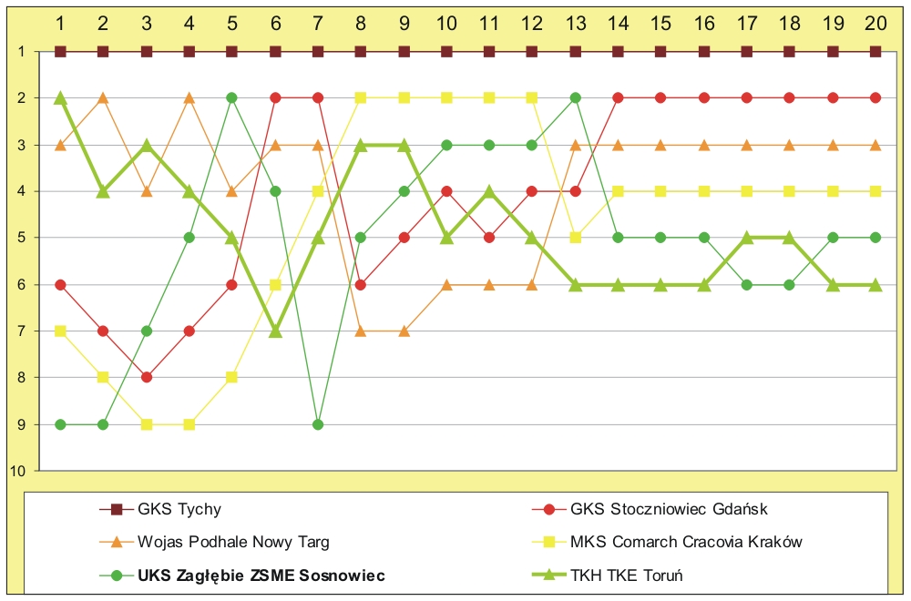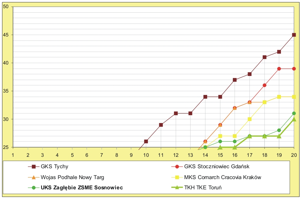 Obie drużyny wyprzedzają obecnie naszą drużynę w tabeli. Czwarta w tabeli Cracovia ma cztery punkty przewagi a piąte Zagłębie tylko jeden punkt (zobacz: ryc. 1 i 2). Stawka jest wysoka, bowiem jeśli torunianie nie poradzą sobie w tych meczach stracą "kontakt" z przeciwnikami i oddalą od siebie perspektywę awansu w tabeli. Jeśli jednak uda się uszczknąć punkty na terenie rywala i dodatkowo korzystnie dla nas ułożą się mecze przeciwników już po weekendowych grach możemy wskoczyć nawet na trzecie miejsce w tabeli.