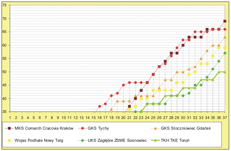 Faktem jest, że TKH niezmiennie zajmuje szóste miejsce w silniejszej grupie, a GKS ciągle znajduje się w czubie tabeli. Obecnie obie ekipy dzieli szesnaście punktów w tabeli (patrz: ryc. 2)! Po ostatniej porażce w Krakowie z ComArch Cracovią, tyszanie stracili fotel lidera na rzecz aktualnego mistrza kraju (patrz: ryc. 1). Nic jednak nie stoi na przeszkodzie, żeby go odzyskać. Trudno się bowiem spodziewać, że torunianie będą w stanie odebrać punkty Ślązakom, zważywszy na ich ostatnie poczynania.