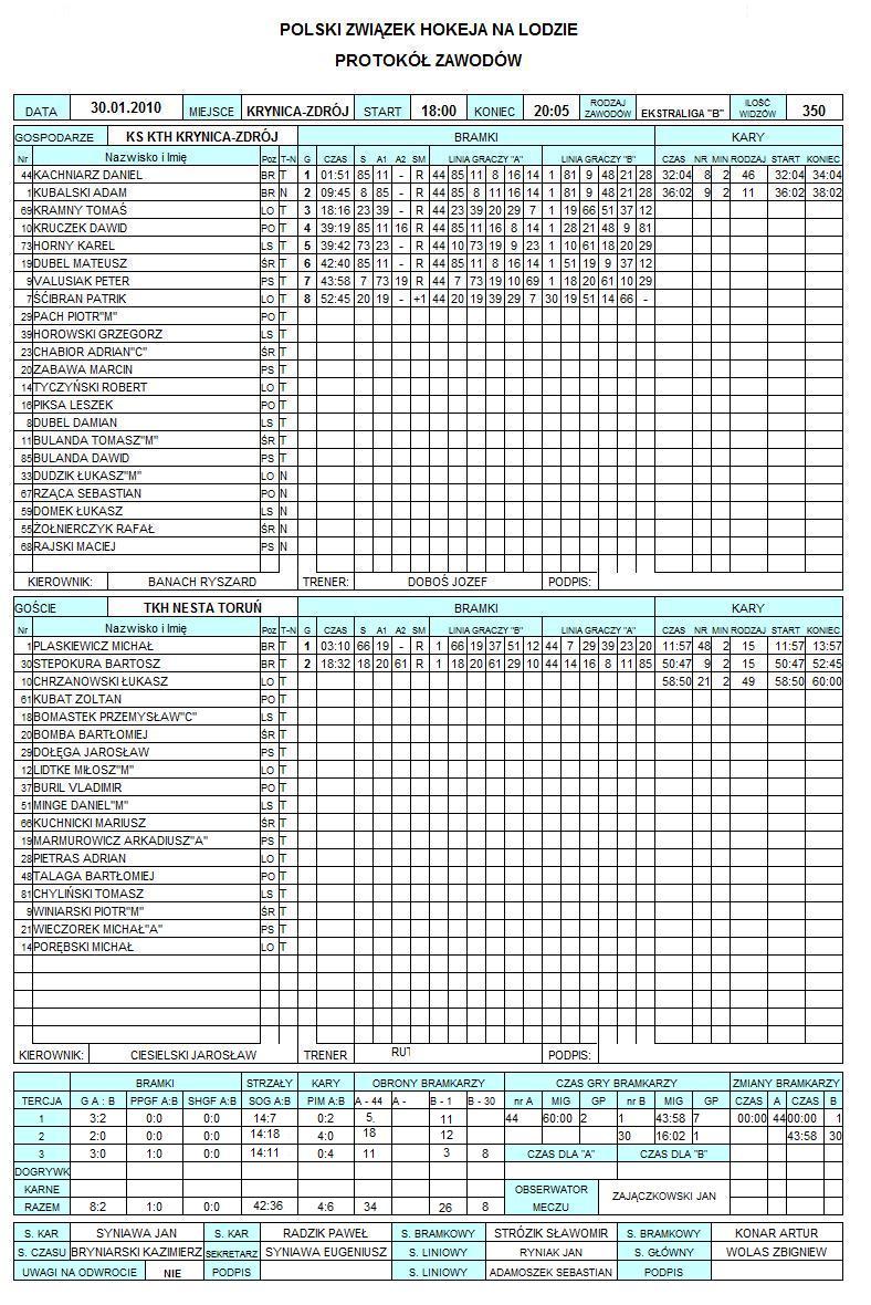 KTH Krynica: 4 (0, 4, 0); TKH Nesta: 6 (2, 0, 4) / w tym 2 min. kary technicznej